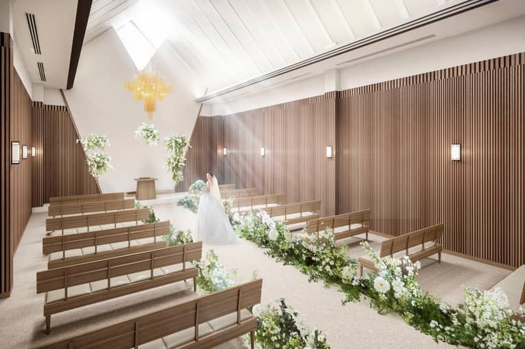 木をメインに使ったぬくもりのあるチャペル‘ヴィヴィ’。自然の光が入り幻想的な雰囲気に包まれます。ゲストをより身近に感じられる式場です。