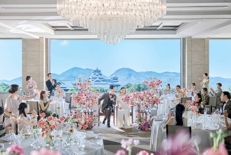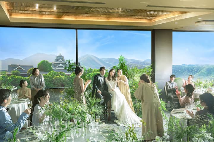 ホテル最上階の披露宴会場は、おふたりの背景に熊本城が映り、熊本ホテルキャッスルならではのロケーションを堪能。